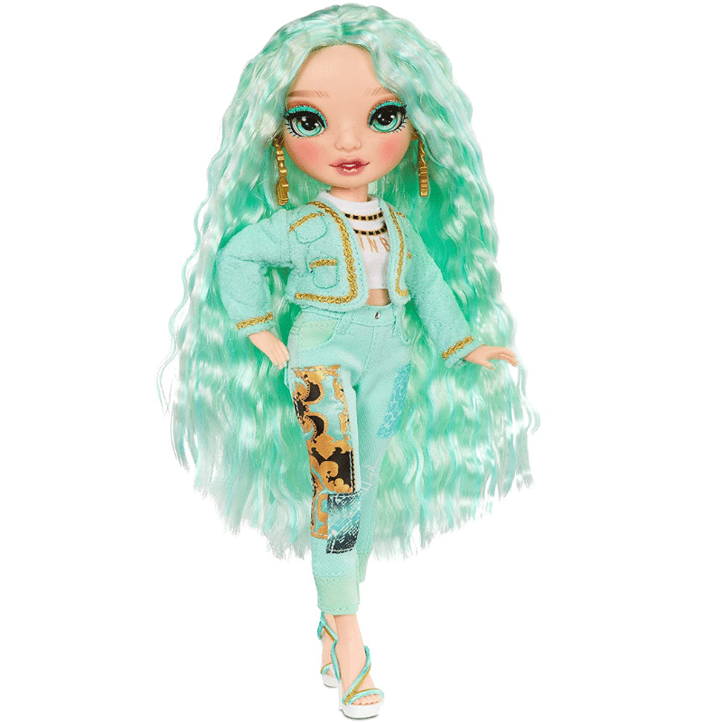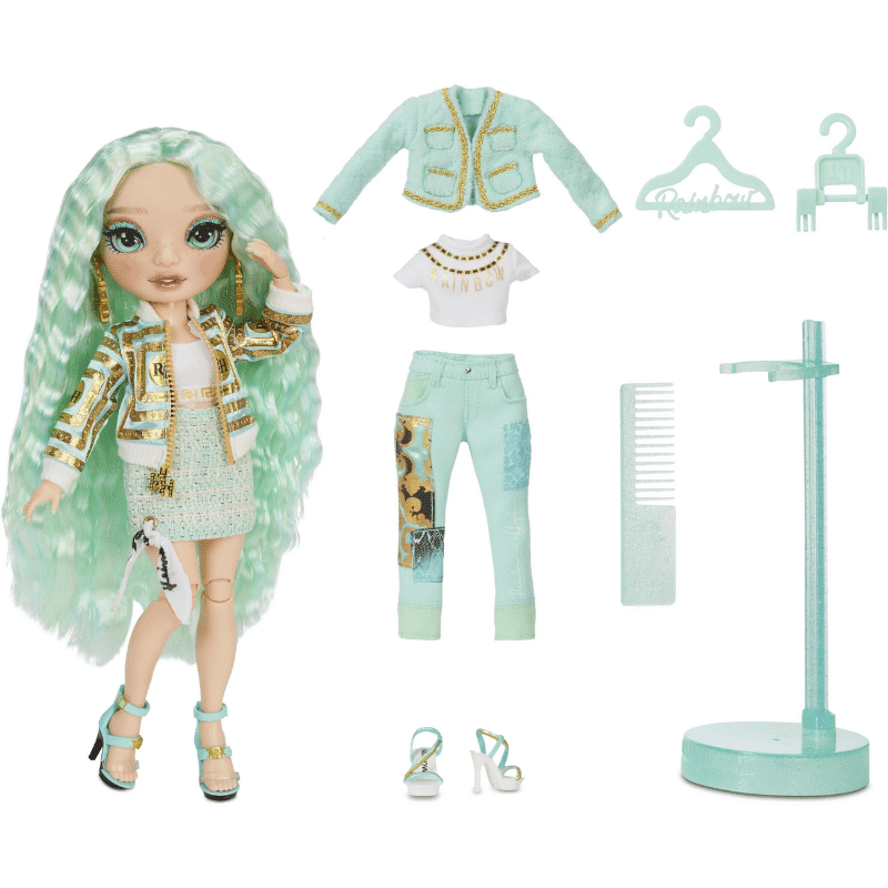 Rainbow High -muotinuket rakastavat muotia ja he ovat aina pukeutuneet tyylilleensä uskollisesti! Jokaisella heistä on omat lempivärinsä ja omalaatuiset tyylinsä. Nuken hiukset ovat vähintään yhtä upeat kuin hänen asunsa: pitkät, harjattavat ja värikkäät hiukset viimeistelevät muodikkaan tyylin! Ennen ensimmäistä hiustenharjausta, pese nuken hiukset muotoilugeelin poistamiseksi ja anna hiusten kuivua kokonaan. Daphne rakastaa erityisesti mintunvihreää väriä, niinpä hän pukeutuu yleensä aina mintunvihreisiin vaatteisiin! Hänellä on myös upeat vihreät hiukset, jotka yltävät melkein maahan asti. Mukana kaksi upeaa asukokonaisuutta: kultaisilla yksityiskohdilla koristeltu takki, paita, hame, t-paita, farkut ja kaksi kenkäparia. Sisältää myös tarvikkeita: kampa, teline nukelle ja kaksi vaatehenkaria.
