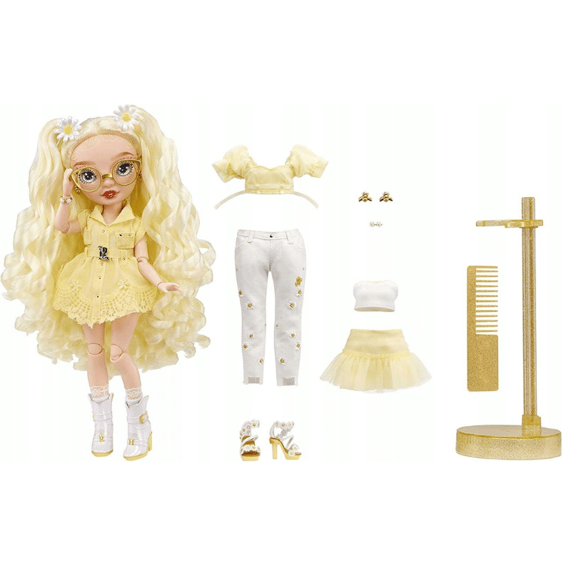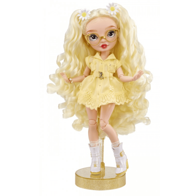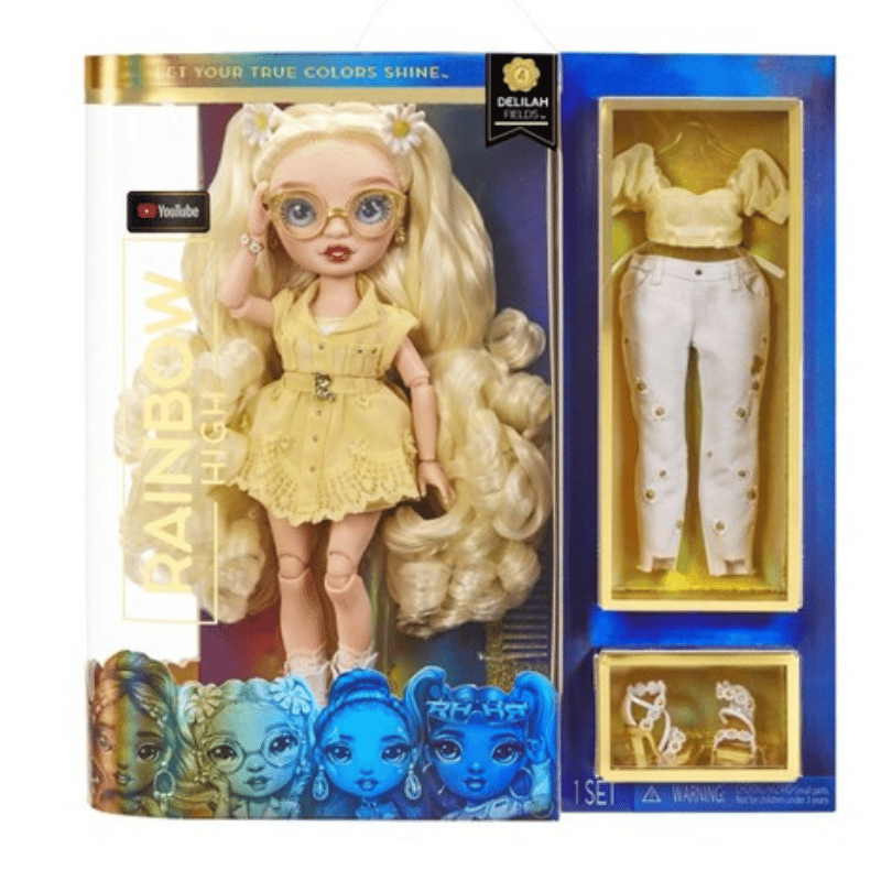 Upeat OMINAISUUDET: Delilah Fieldsillä on ainutlaatuinen muotoilu ja se on pukeutunut BUTTERCUP YELLOWiin päästä varpaisiin. Delilah on ensimmäinen nukkemme, jossa on Albinism ja jolla on valkoiset silmäripset ja tyylikkäät silmälasit. Hänellä on muodissaan upeita yksityiskohtia, kauniit kiharretut hiukset hiusrenkailla, pitkät silmäripset ja lasisilmät. Kerää Rainbow kaikista upeista Rainbow High fashion -nukkeista.
