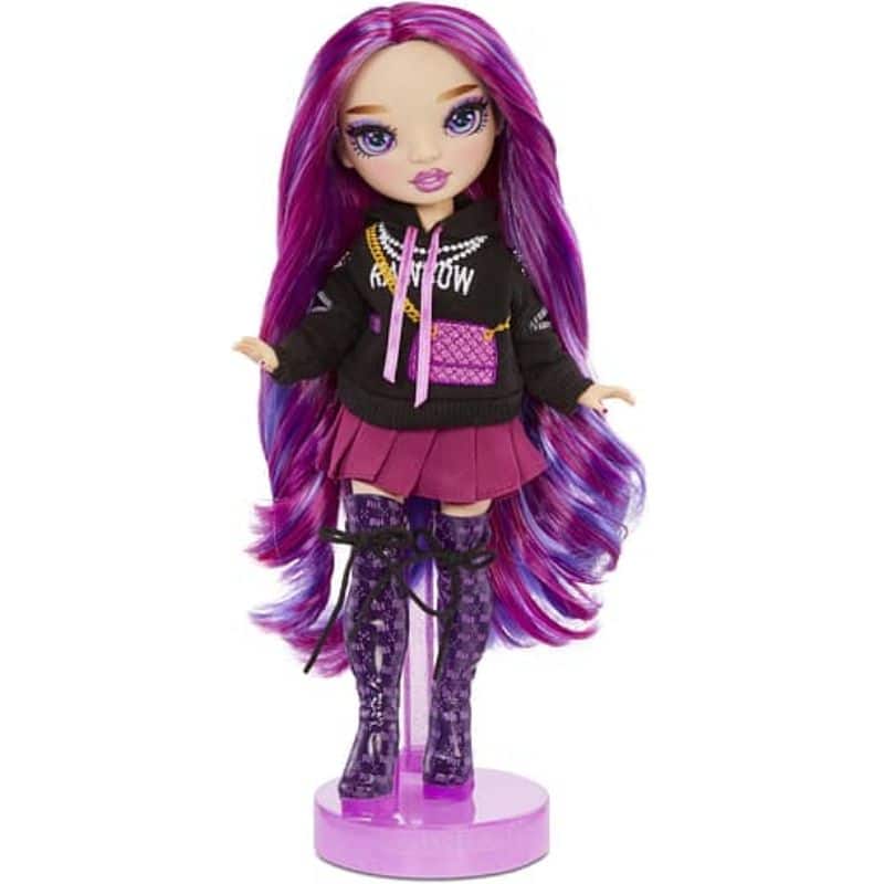 Rainbow High -muotinuket rakastavat muotia ja he ovat aina pukeutuneet tyylilleensä uskollisesti! Jokaisella heistä on oma tyyli ja oma lempivärinsä. Nuken hiukset ovat vähintään yhtä loistavat kuin hänen asunsa: pitkät, harjattavat ja värikkäät hiukset viimeistelevät muodikkaan tyylin! Ennen ensimmäistä kertaa kun harjaat nuken hiukset, pese nuken hiukset muotoilugeelin poistamiseksi ja anna hiusten kuivua kokonaan. Emi rakastaa violettia väriä, niinpä hän pukeutuu yleensä aina violetinsävyisiin vaatteisiin! Hänellä on myös tyrmäävät violetit hiukset, jotka menevät melkein maahan asti. Mukana kaksi asukokonaisuutta: vaaleanpunainen ja musta huppari, kaksi hametta ja kaksi violettia kenkäparia. Tuote sisältää myös tarvikkeita: kampa, teline nukelle ja kaksi vaatehenkaria.