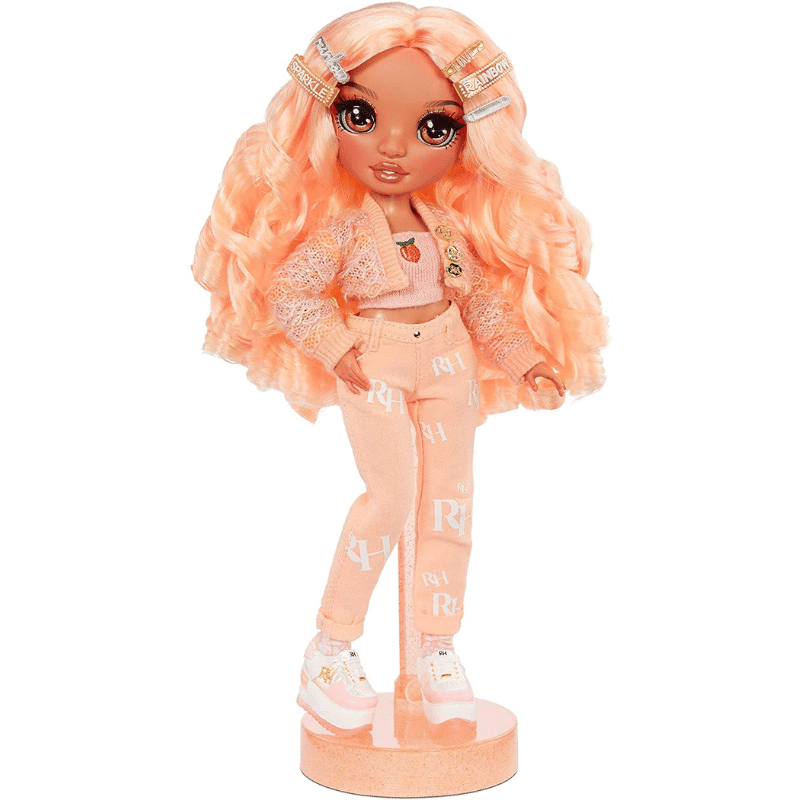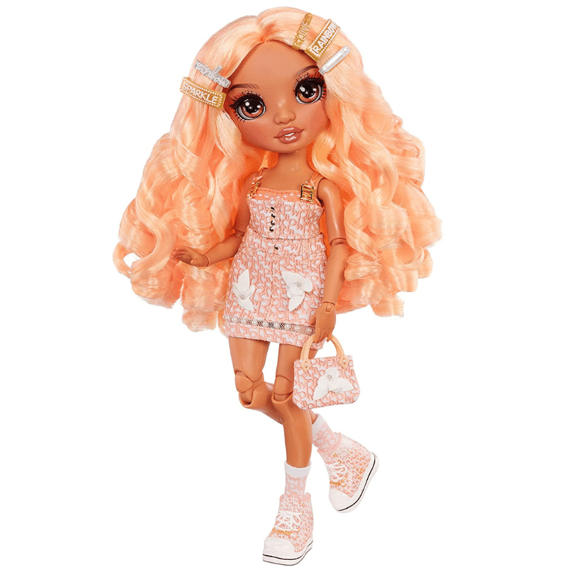 Rainbow High -muotinuket rakastavat muotia ja he ovat aina pukeutuneet tyylilleensä uskollisesti! Jokaisella heistä on omat lempivärinsä ja omalaatuiset tyylinsä. Nuken hiukset ovat vähintään yhtä upeat kuin hänen asunsa: pitkät, harjattavat ja värikkäät hiukset viimeistelevät muodikkaan tyylin! Ennen ensimmäistä hiustenharjausta, pese nuken hiukset muotoilugeelin poistamiseksi ja anna hiusten kuivua kokonaan. Georgia rakastaa erityisesti persikansävyistä väriä, niinpä hän pukeutuu yleensä aina persikanpunaisiin vaatteisiin! Hänellä on myös upeat, kiharat, persikanväriset hiukset. Mukana kaksi asukokonaisuutta: takki, kaksi toppia, laukku, housut, hame ja kaksi kenkäparia. Sisältää myös tarvikkeita: kampa, teline nukelle ja kaksi vaatehenkaria.