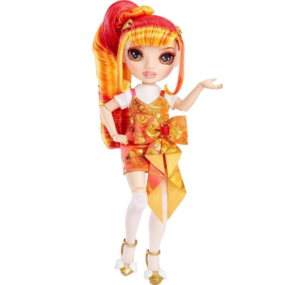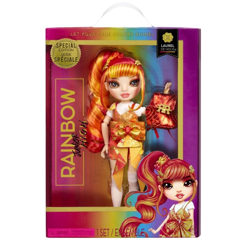 Esittelyssä on Rainbow High Junior Laurel De’vious-muotinukke. Rainbow High stimuloi luovuutta! Palaa ajassa taaksepäin ja tapaa suosikkioppilasi ennen kuin heistä tuli ystäviä ja he seurasivat luovia unelmiaan Rainbow Highiin. Jokaisessa teemassa on täydellinen nukkeasu, nukke uusilla nuoremmilla kasvoveistoksilla ja pehmeä vinyylireppu koulutarvikkeiden kuljettamiseen. Tämä leikkisarja tarjoaa lapsille loputonta iloa ja mielikuvituksellista tarinankerrontaviihdettä. Laurel De’Vious on pukeutunut päästä varpaisiin punaiseen ja oranssiin. Hänellä on upea nuorempi kasvoveistos, yksityiskohtaiset piirteet muodissaan, kaunis pitkä punainen ja oranssi ponin häntä otsatukkaineen, pitkät silmäripset ja lasisilmät.