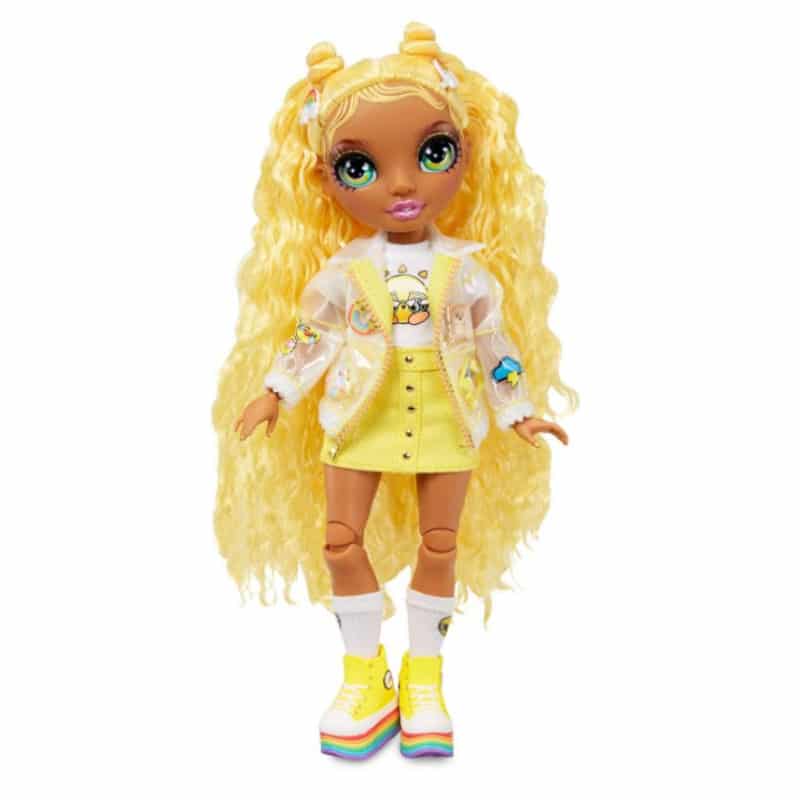 Pakkaus sisältää Rainbow High Junior Sunny Madison-muotinuken, asu kokonaisuuden, pehmeän repun, kamman ja kengät.