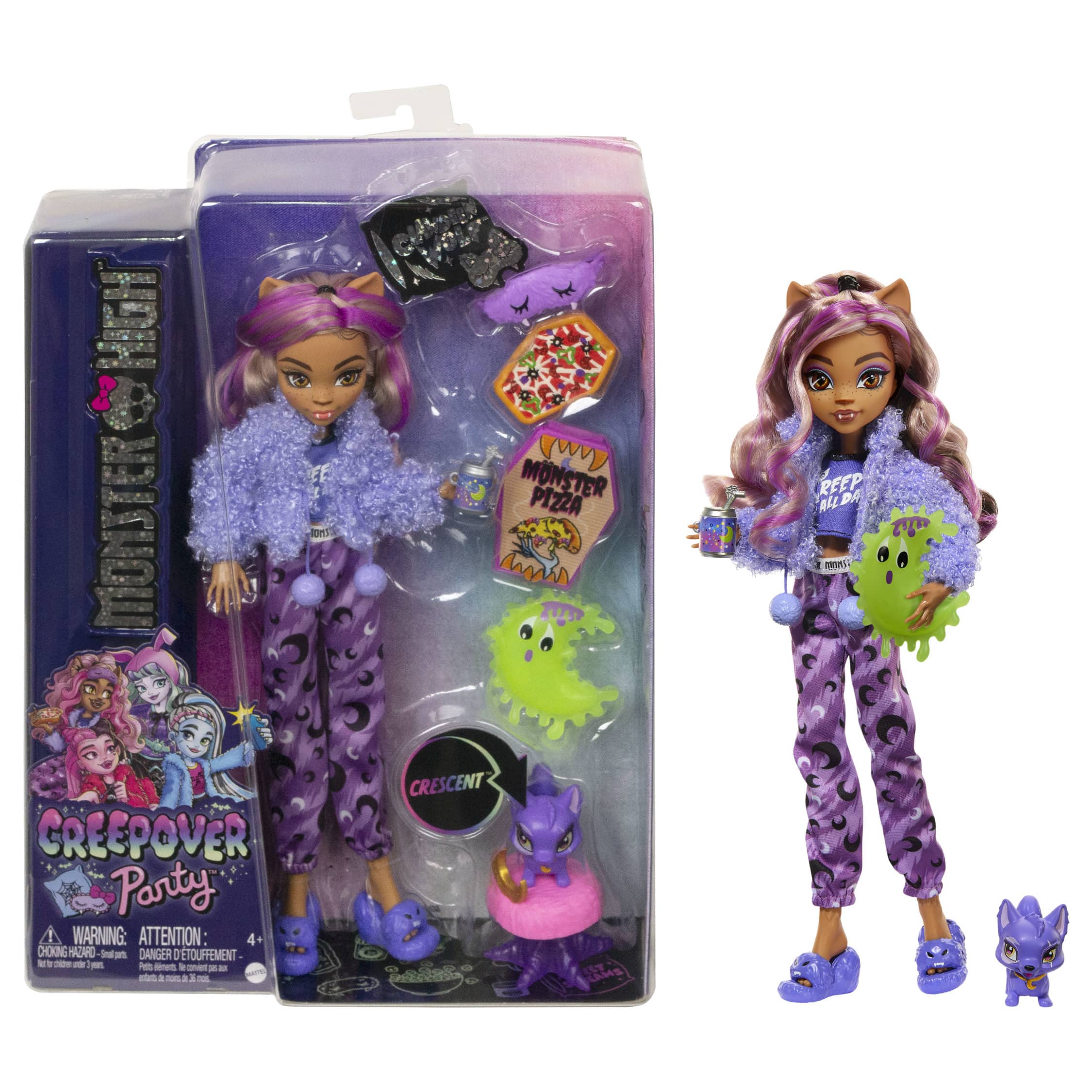 Pyjamabileet Monster High -tyyliin on hemmottelua ripauksella kummitustaikoja! Clawdeen on pukeutunut tyylilleen uskollisesti ja hänellä on mukanaan lemmikki ja yhteensä seitsemän pyjamabileisiin liittyvää tarviketta. Ikäsuositus yli 4-vuotiaille.