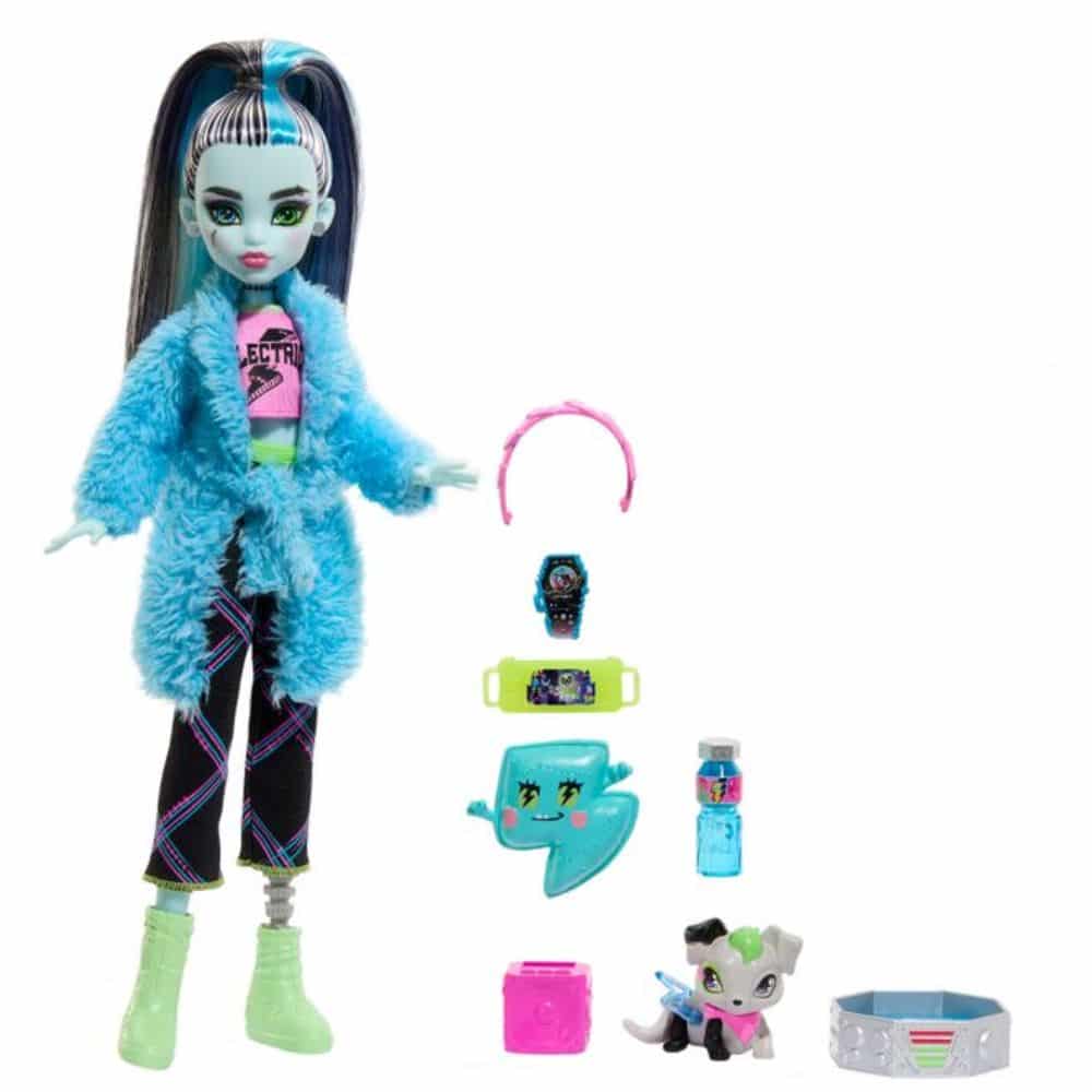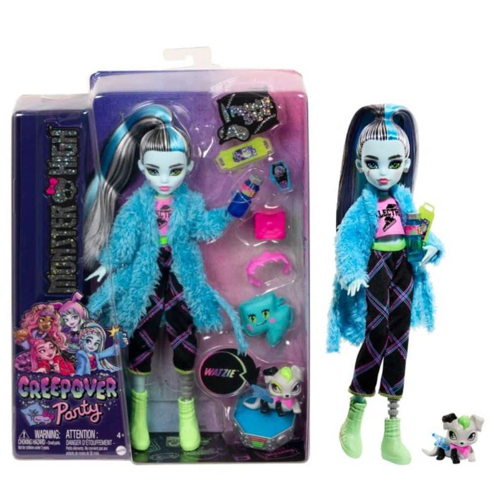 Pyjamabileet Monster High -tyyliin on hemmottelua ripauksella kummitustaikoja! Frankie on pukeutunut tyylilleen uskollisesti ja hänellä on mukanaan lemmikki ja yhteensä seitsemän pyjamabileisiin liittyvää tarviketta. Ikäsuositus yli 4-vuotiaille.
