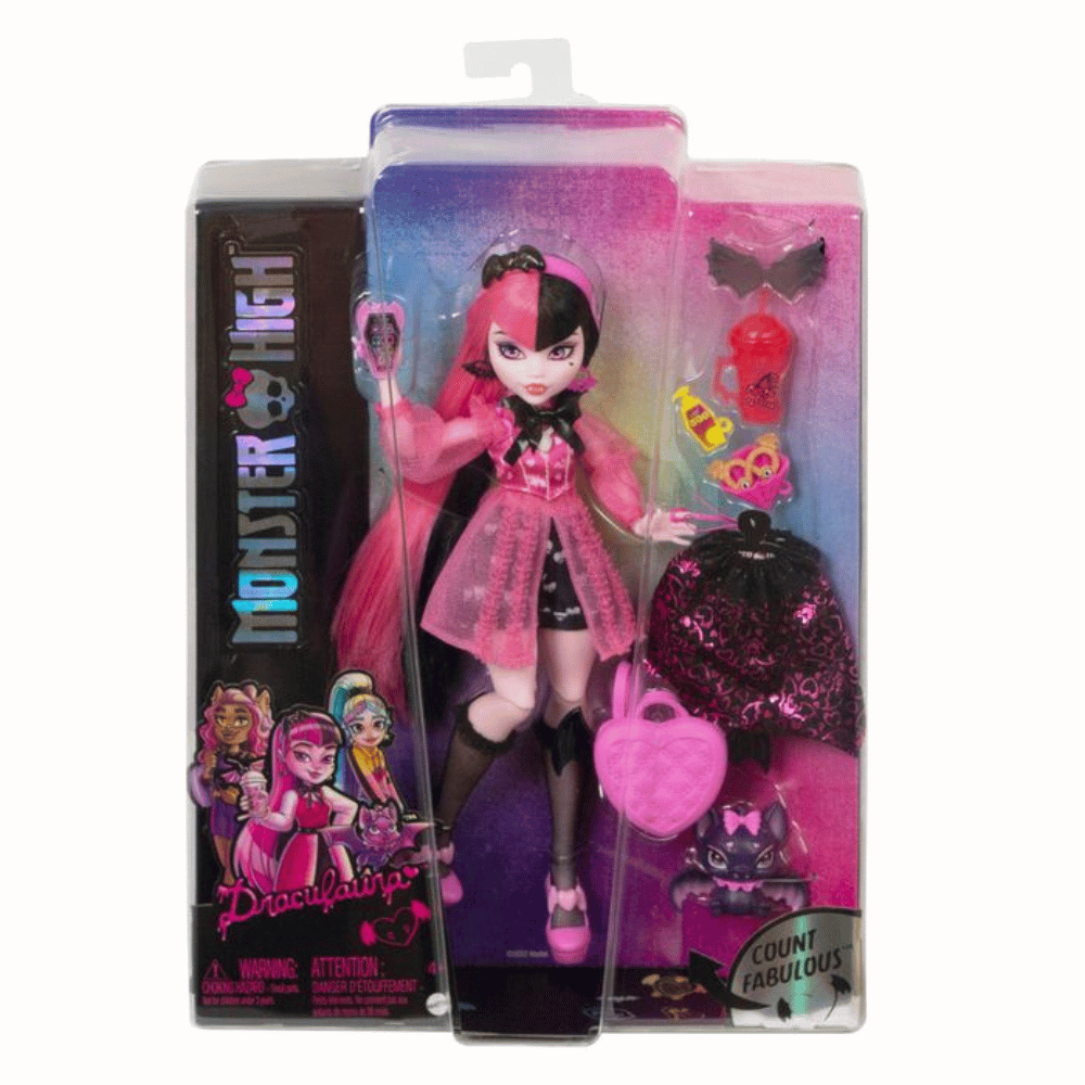 Monster High Draculaura on ihana Monster High-teemainen nukke. Nukella pinkkimusta tyyli, kaksinväriset hiukset, mekko, polvisukat. Nuken mukana tulee lemmikki ja erilaisia asusteita. Nuken osia pystyy liikuttaa.
