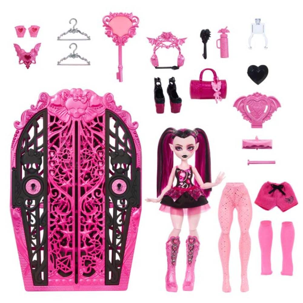 - Koristeellisesta hissistä paljastuu suosittu kaunis Draculaura-nukke ja yli 19 vaatetta ja asustetta, joilla loihdit mielikuvituksellisia tyylejä jokaiseen Monster High -koulupäivään