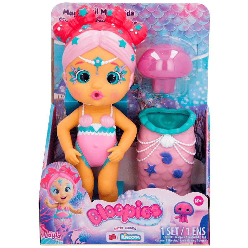 Suloiset Bloopies merenneidot ovat parasta kylpyseuraa. Glitterpyrstö on irrotettava, ja se vaihtaa lämpimässä vedessä väriä! Merenneito puhaltaa vettä ja kuplia, kun painat sitä masusta.