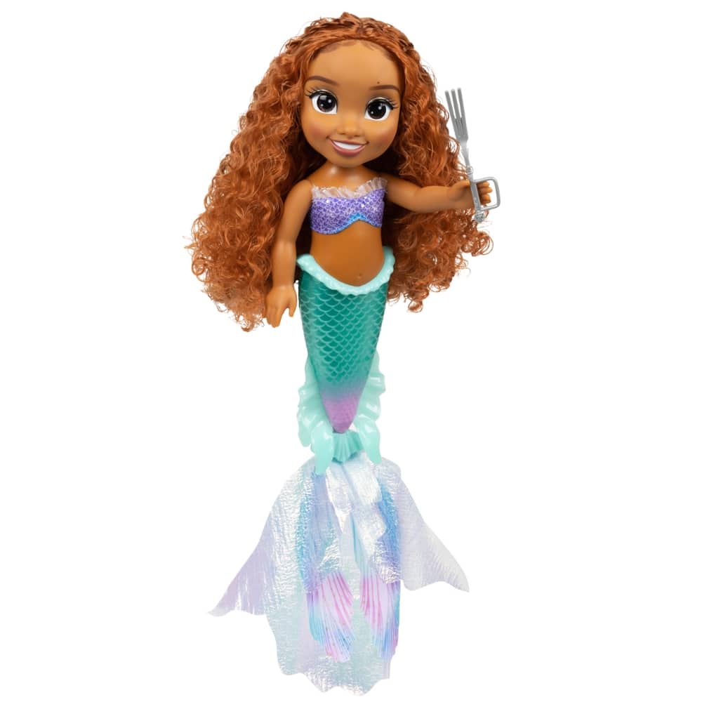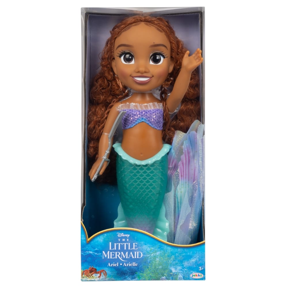 Disney Little Mermaid Ariel nukke 38 cm – Disneyn uutuuselokuvan Pieni Merenneito Ariel on nyt ihastuttavana nukkena! Muovinuken korkeus on 38 cm. Merenneidolla on kaunis pyrstö, elokuvan tähdittämä asuste, pitkät hiukset, isot silmät ja kädessään haarukka. Nukella on liiikkuvat kädet, pää ja pyrstön alaosa. Nyt voi merenneitoseikkailut alkaa! Ikäsuositus: 3+ vuotta.