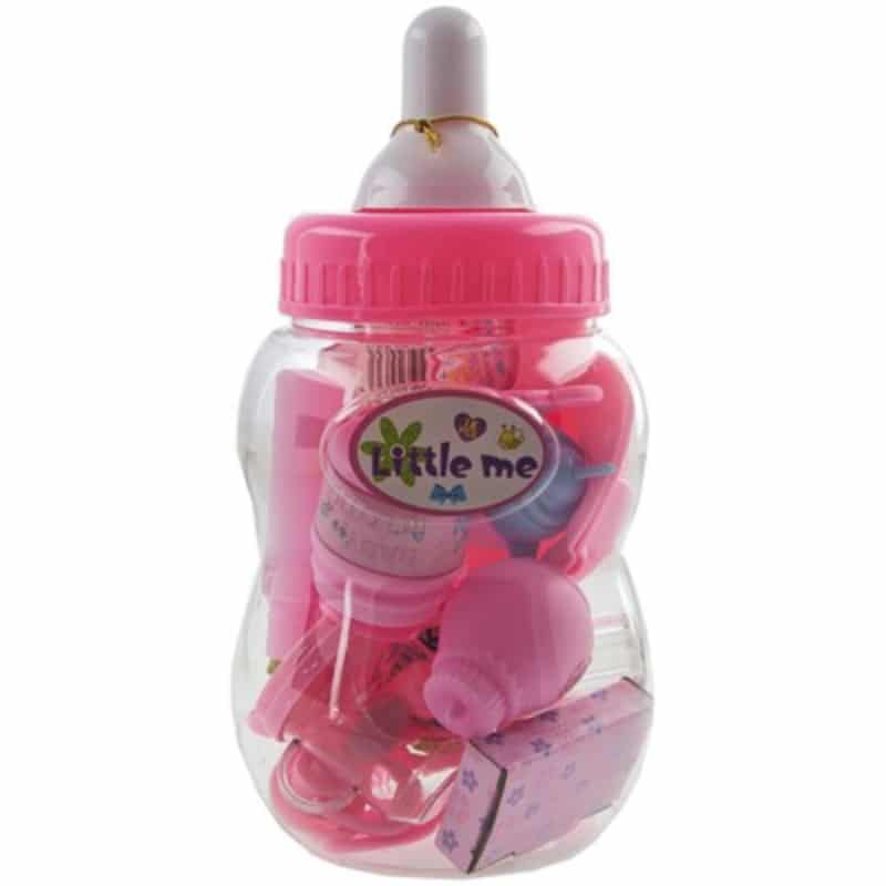 Hauska iso vaaleanpunainen tuttipullo sisältää erilaisia nukkevauvan hoidossa tarvittavia tarvikkeita, kuten ruokailuvälineitä, pulloja, tutin, harjan, tuttipullon, leikkitalkkipurkin, rasvaa ja tutin. Leikin päätyttyä tarvikkeet pysyvät tallessa tuttipullossa.