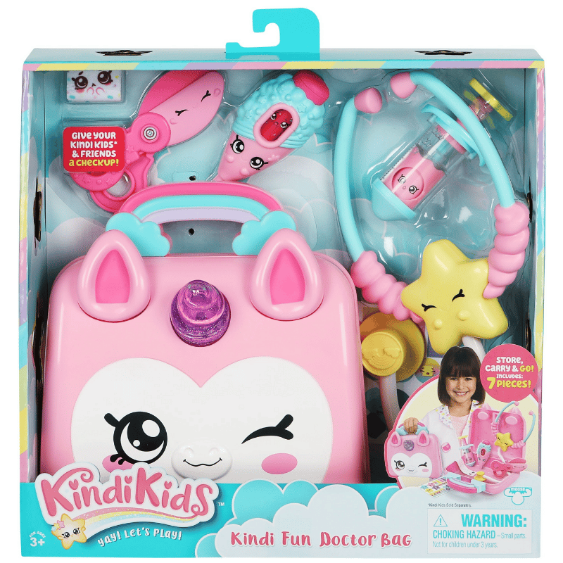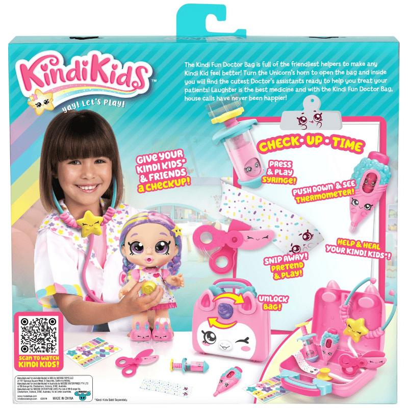 Pidä huolta pienistä ystävistäsi. Avaa laukku kiertämällä yksisarvisen sarvea ja Kindi Kids-lääkärilaukusta löytyy kuumemittari, jolla voit mitata nukkesi kuumeen, se antaa aina eri tuloksen. Voit kuunnella stetoskoopilla nukkesi sykettä ja antaa ruiskulla lääkettä. Ruiskun pyörivät kasvot kertovat, että voiko pikkuystäväsi jo paremmin.