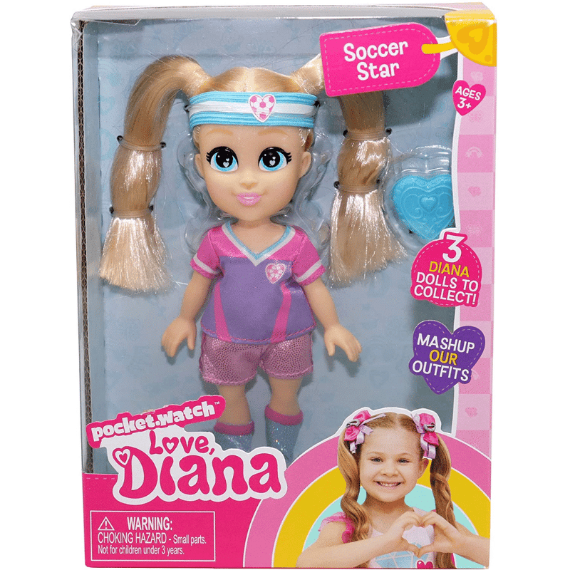 Love Diana on jalkapallon tähtipelaaja! Dianalla on yllään tyylikäs jalkapalloilijan asu, ja mukana tulee hiusharja nuken hiusten muotoiluun.