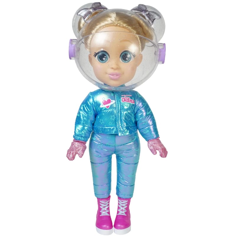 Pakkaus sisältää: Love Diana-nuken, siniset muuntuvat kampaaja ja astronautti vaatteet, pinkit kengät, glitter käsineet, harjan, kaksi lahjakoria, leikkikuivaajan sekä rannekorun.