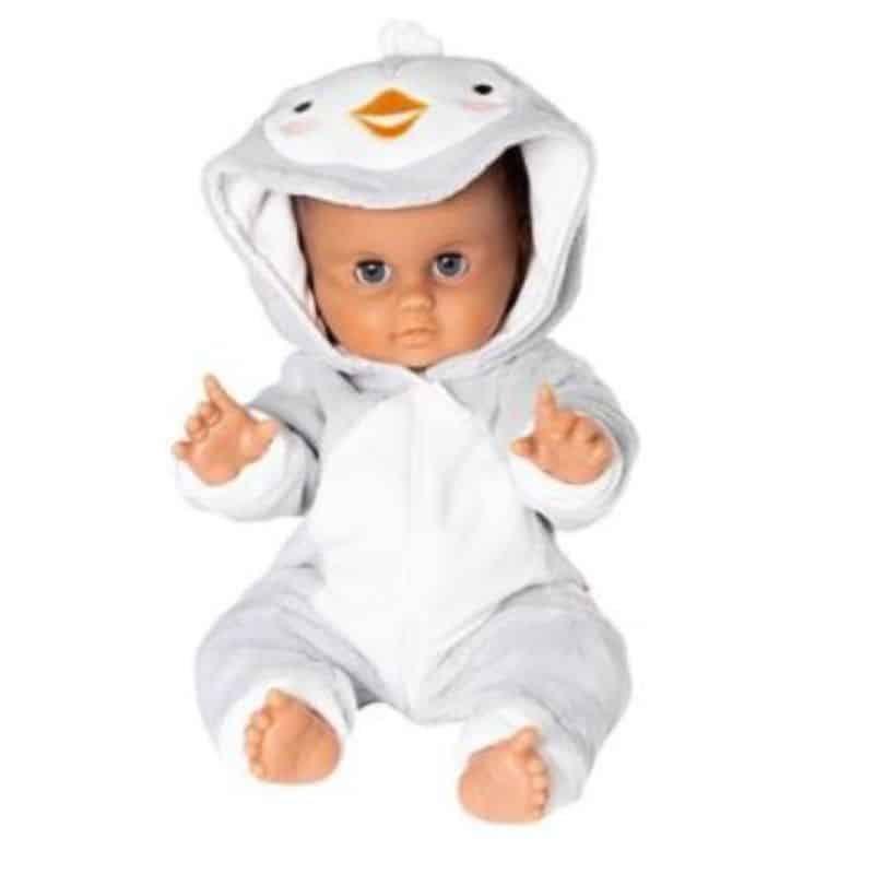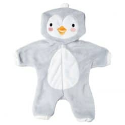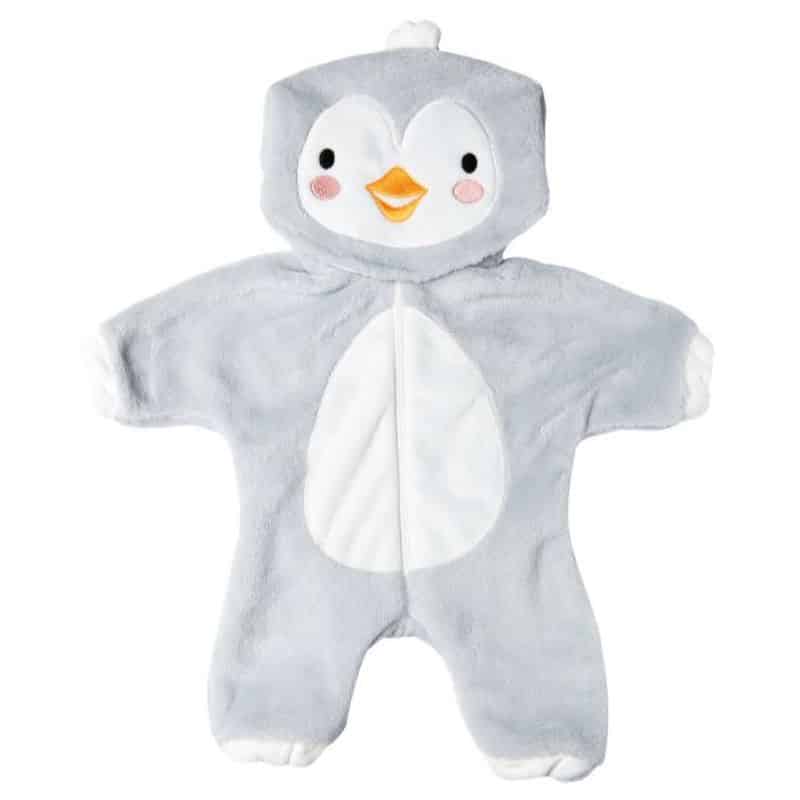 Hauska pehmeä pingviini haalari sopii 35-45 cm kokoisille nukeille. Haalari on mukavan pehmeä sisältä ja ulkoolta ja sen hupussu on pingviinin naaman kuva. Haalarissa on vetoketju ja se on helppo laittaa päälle ja ottaa pois nuken päältä. Hihoissa ja housuissa on joustavat kuminauhat. Mukana tulee myös puinen pieni henkari.