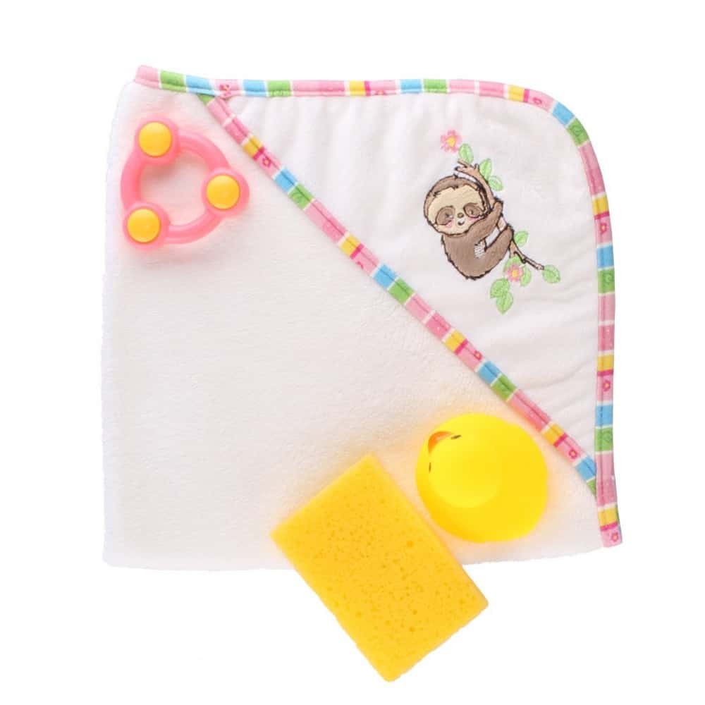 Sisältää: Hupullinen kylpypyyhe, pesusieni, kumiankka ja kylpylelu.