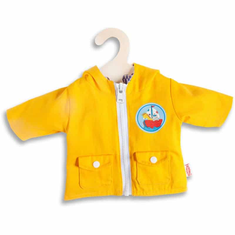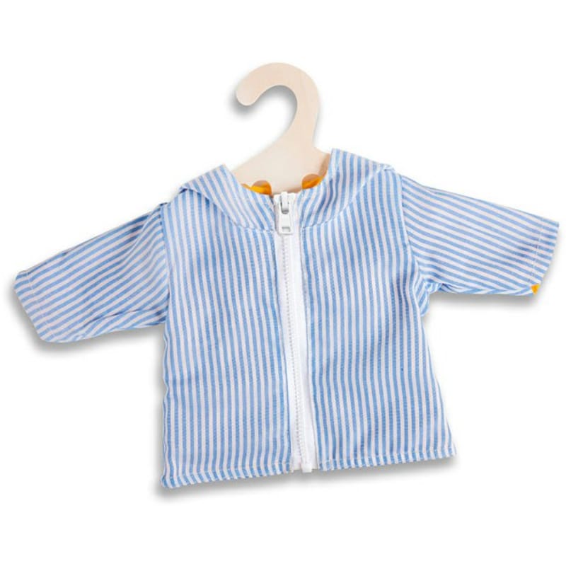 Super hieno nuken kääntösadetakki, joka on toiselta puolelta piristävän keltainen ja toiselta valko-sini raidallinen. Sadetakissa on huppu ja keltaisella puolella taskut. Takki soveltuu 35-45 cm kokoisille nukeille. Saksalainen suunnittelu. Turvalliseksi testattu. Mukana tulee myös puinen henkari.