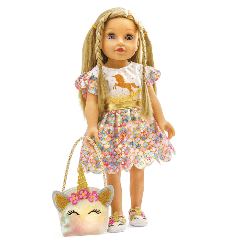 Tämä upea kimalteleva käsilaukku kruunaa asukokonaisuuden! Yksisarviskäsilaukussa on kimalteleva yksisarvinen ja hopean-kultaiset kimaltelevat korvat. Laukussa on myös koristeina ommellut silmät, kukkia ja tarrakiinnitys. Käsilaukkuun sopivat yksisarvismekko ja -balleriinat myydään erikseen.