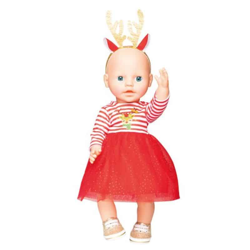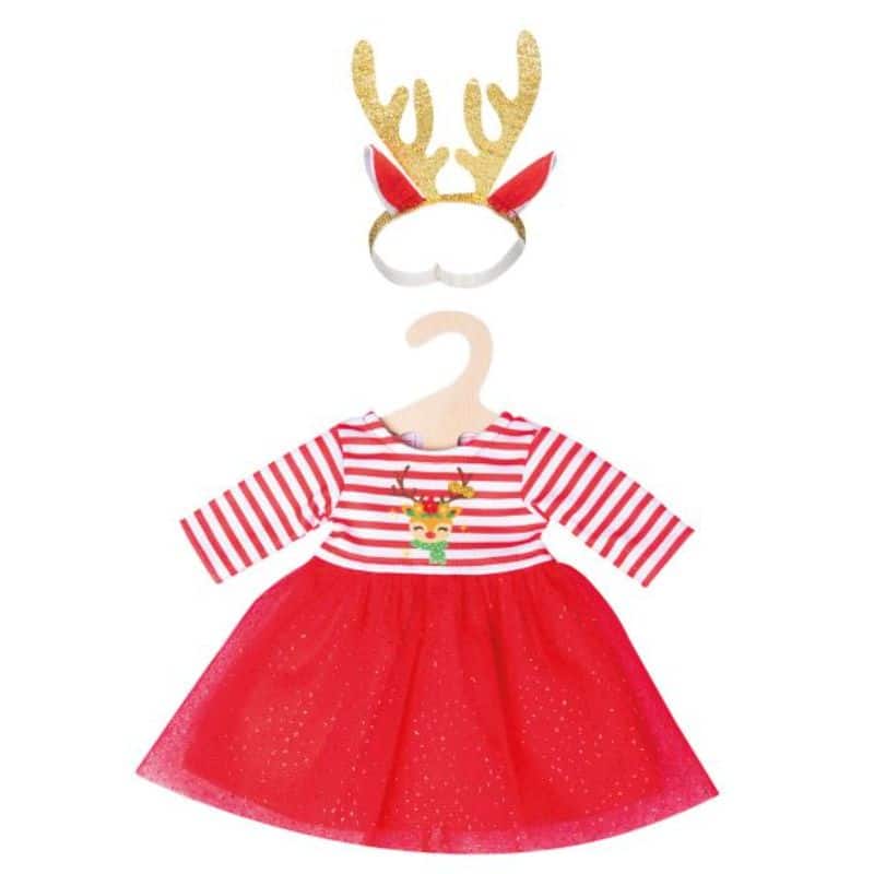 Kaunis nuken juhlamekko, jossa on puna-valkoraidallinen yläosa ja jota koristaa suloinen poro, jolla on kukka ja resetti päässään. Mekon hame on monikerroksinen ja sen verkko-osaa kaunistaa punaiset glitteriset pisteet. Asun kruunaa poropanta, jossa on kultaiset sarvet ja punaiset korvat, ja jonka saa helposti nuken päähän siinä olevan kuminauhan ansioista. Tämä asukokonaisuus on ehdoton katseenvangitsija jouluna ja muissa juhlissa!