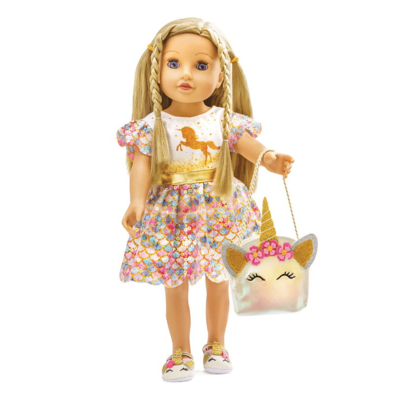 Upea nuken mekko, jonka edessä on printattu kultainen yksisarvinen ja keskellä on kultaista kangasta. Hame osuudessa on merenneidon pyrstön kuviointi, jonka päällä on läpinäkyviä paljetteja. Mekon takana on tarrakiinnitys, joten se on helppo pukea nuken päälle ja ottaa pois. Mekon hihoissa ja alaosassa on hauska kaarimainen muotoilu. Mukana toimitetaan puinen henkari. Nuken samaan sarjaan kuuluvat yksisarviskassi ja -ballerinat myydään erikseen. Osta koko häikäisevä asusetti!