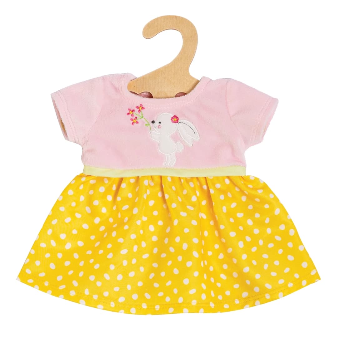 Nuken mekko pupu keltainen/vaaleanpunainen – Ihana nukenmekko, jossa on pirteänkeltainen alaosa ja vaaleanpunainen pehmeä veluuriyläosa, jota koristaa söpö pupun kuva. Sopii 35-45 cm:n pituisille nukeille.