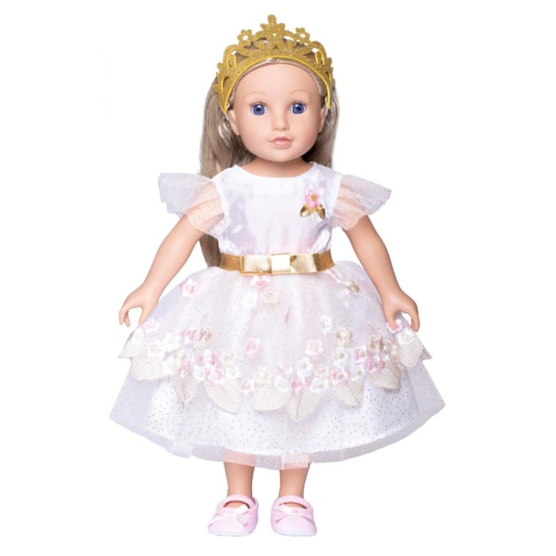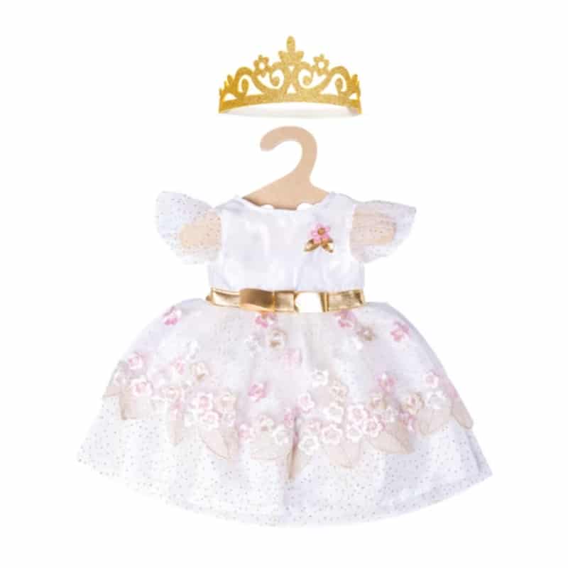 Nyt nukkesi on valmis kaupungin hienoimpiin juhliin tällä upealla, kolmikerroksisella mekolla! Mekko soveltuu 35-45 cm kokoisille nukeille ja on helppo laittaa nuken päälle takana olevan tarrakiinnityksen avulla. Mekossa on kultaisella koristettua tylliä ja päällä kauniita ommeltuja kukkasia. Sen keskellä koristaa kultainen rusetillinen vyö ja asun kruunaa kimaltava kruunu.