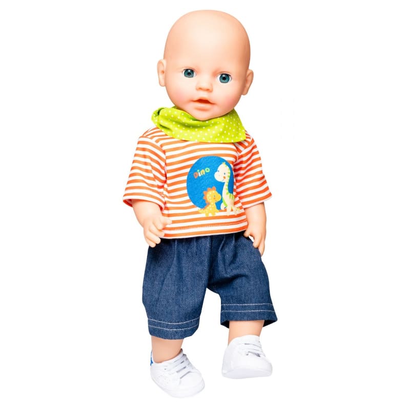 Nukkesi on valmis kesän tuloon tällä asu kokonaisuudella. Pue nukellesi farkkushortsit, valko-puna raidallinen dinosaurus paita ja limenvihreä huivi. Asut soveltuvat 35-45 cm kokoisille nukeille. Saksalainen suunnittelu. Turvalliseksi testattu. Mukana tulee myös puinen henkari.
