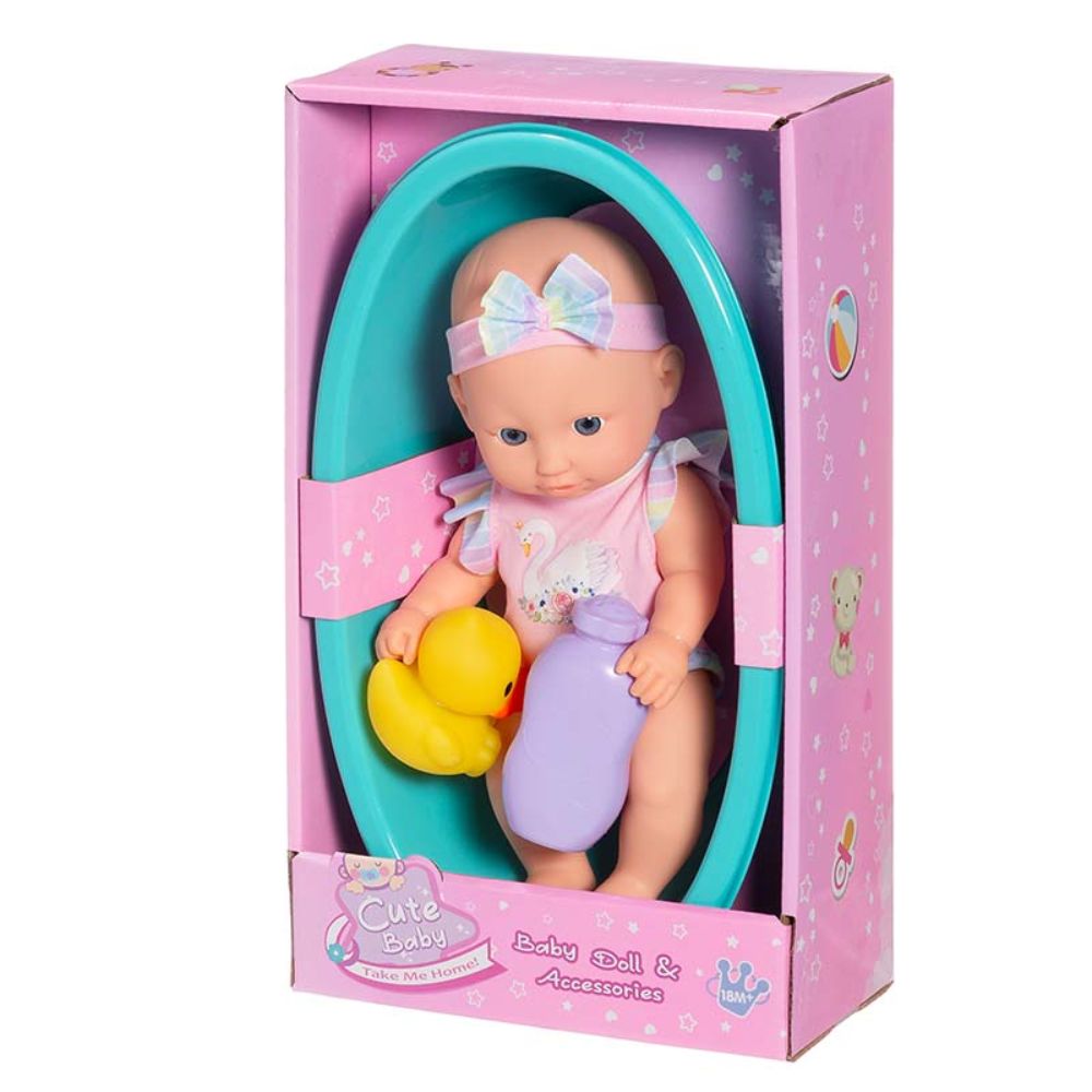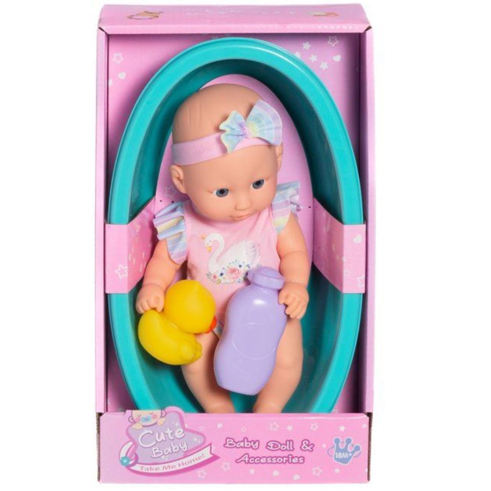 Leikkisetissä nukke 26 cm kylpyammeessa 31,50 cm, tuttipullo ja kylpylelu.