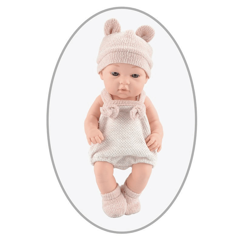 Vastasyntyneen näköinen vauvanukke, jolla on suloiset vaatteet. nuken yllä on sukat, pipo jossa on korvat sekä haalari. Pakkauksessa on nuken mukana vaippa sekä ruokalappu. Kaikki vaatteet ovat hempeän vaaleanpunaisia.