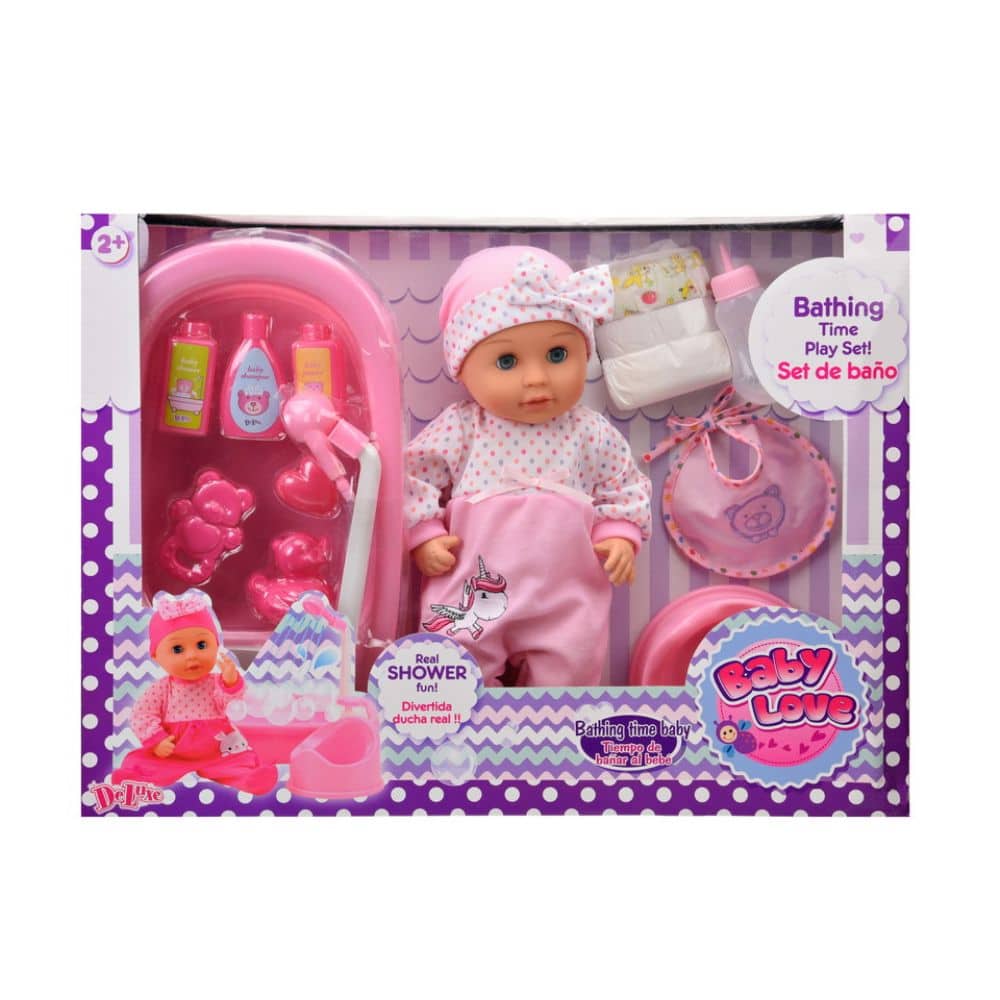 Nukke 37 cm ja kylpytarvikkeet – Baby Love kylpynukke lahjapakkaus sisältää ison vauvanuken sekä paljon erilaisia tarvikkeita. Setissä mm. kylpyamme, erilaisia kylpytarvikkeita, potta, vaippa, ruokailutarvikkeita ja vaatteet.