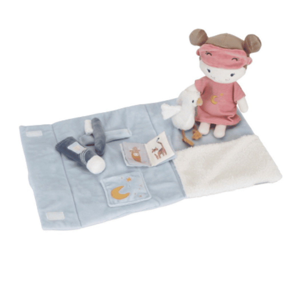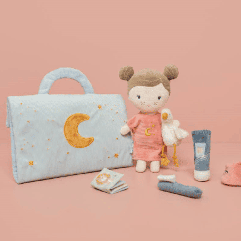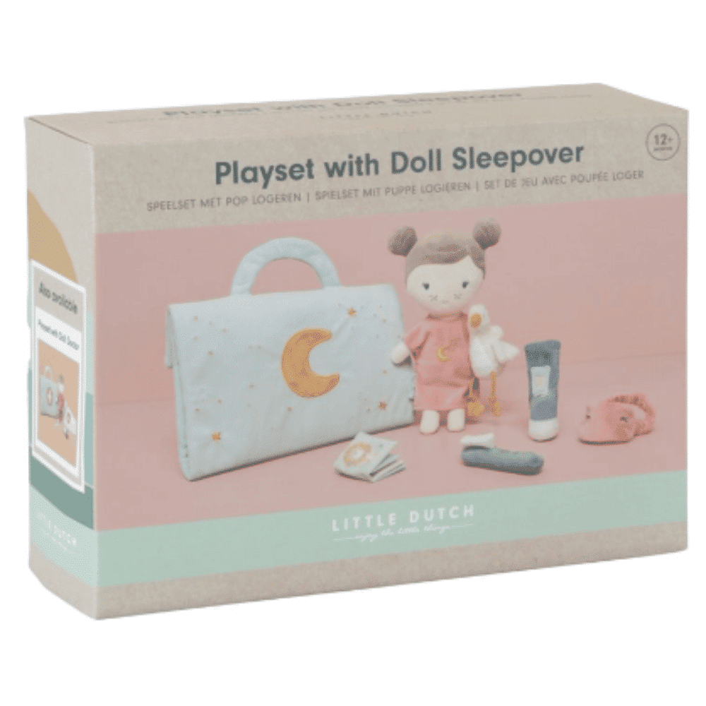 Nukke leikkisetti yökylässä Little Dutch On nukkumisen aika! Roosa ei yksinkertaisesti malta odottaa. Hän on pakannut matkalaukkunsa kaikki olennaiset tavarat yöksi. Tietysti hänen suosikki pehmolelu on mukana hänen kanssaan. Missä haluaisit yöpyä yhdessä? Huoneessasi vai suunnitteletko vierailua isovanhempasi luo? Minne ikinä menetkin, Rosa on siellä halailemaan ja leikkimään.
