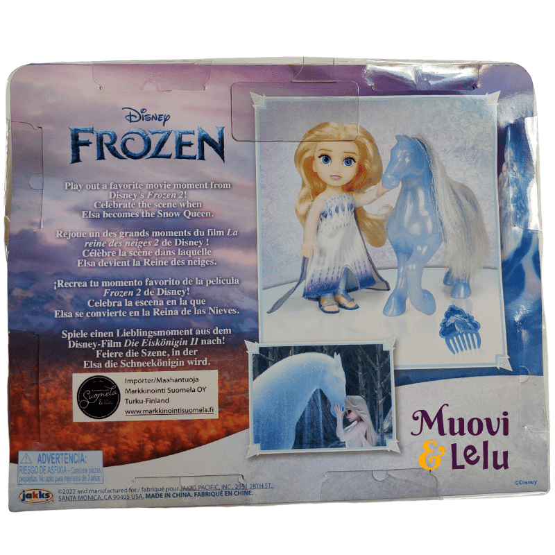 Lähde seikkailulle Frozen Elsan ja sen hevosen kanssa ja leiki lempi Frozen 2 elokuva hetkesi uudelleen! Elsalla on yllään kaunis liilan sävytteinen irrotettava kimalteleva mekko ja sandaalit jalassa. Mukana tulee kampa, jolla voit kammata Elsan upeita pitkiä hiuksia. Ylväästi seisovalla hevosella on teline selässä, johon voit laittaa nuken istumaan. Elsa-nukella on liikkuvat raajat ja sen korkeus on noin 15 cm. Inspiroiva lahja idea yli kolme vuotiaille pikku-prinsessoille!