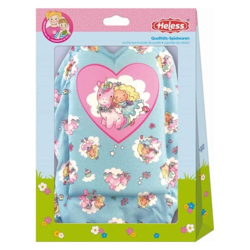 Rintarepussa voit kantaa nukkea kätevästi mukanasi. Rintarepussa on kuvia yksisarvisesta ja keijusta. Sopii 35-50 cm pitkille nukeille.