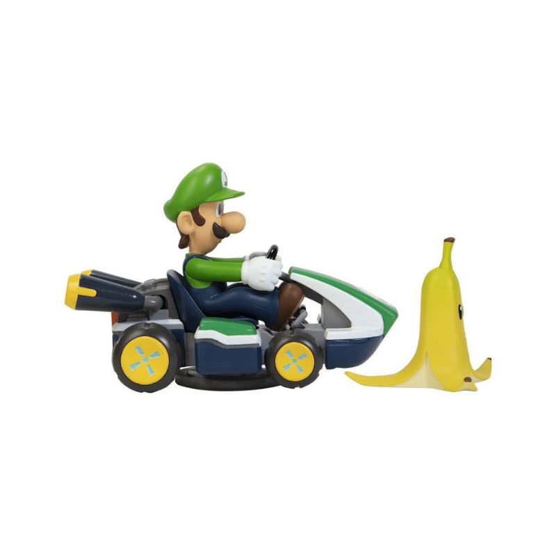 Spin out Mariokartin kanssa voit kilpailla missä tahansa. Kääri kartta, paina kaasua ja varo banaaninkuorta! Liipaisimen avulla auto pyörii 360 astetta. Tuote sisältää Super Mario ajoneuvon, jossa Super Mario istuu sekä banaaninkuoret.