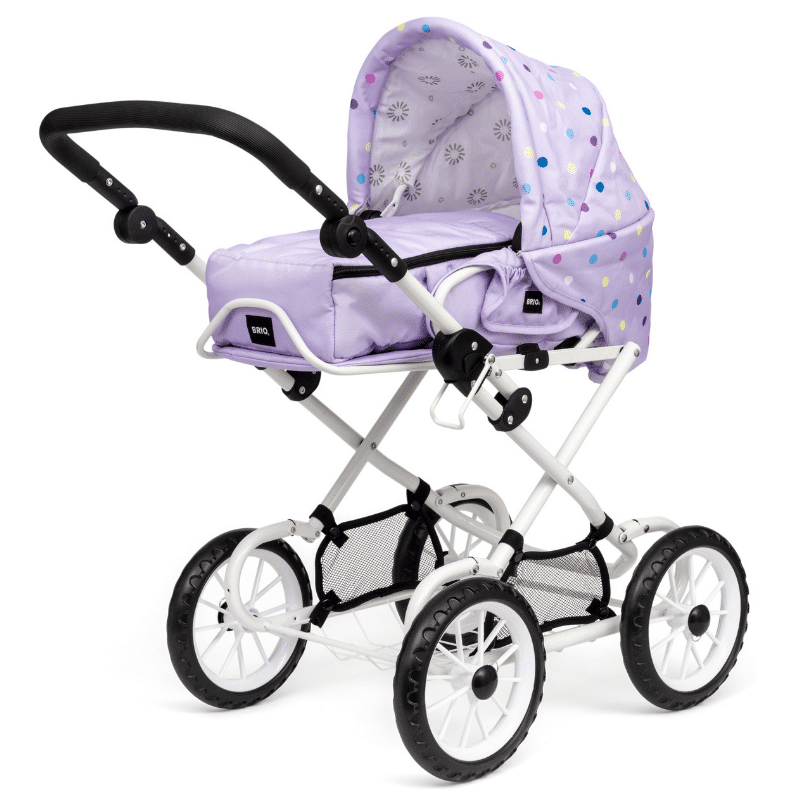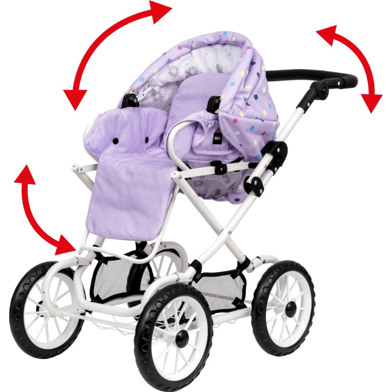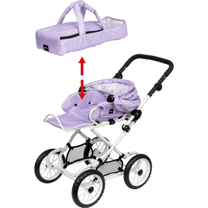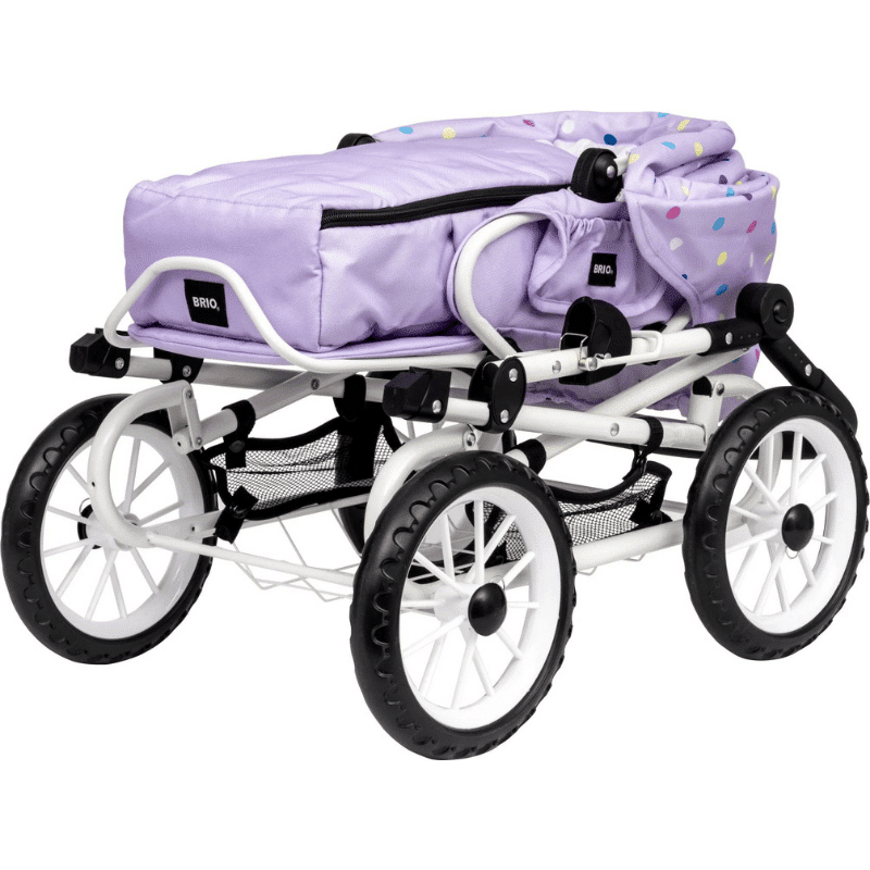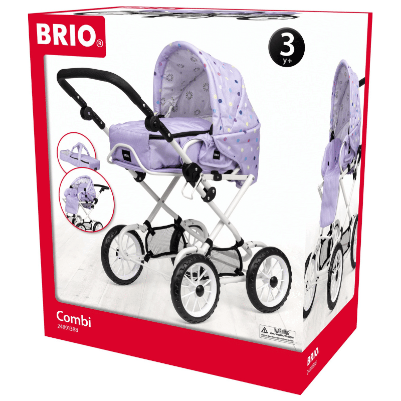 Aivan kuten oikeat yhdistelmävaunut, myös Combi -nukenvaunut on varustettu koko päivän kestävää nukenvaunuilla leikkimistä varten. Näissä laadukkaissa ja klassisissa BRIO-nukenvaunuissa on säädettävä istuin, jalkatuki ja aisa eri-ikäisten ja eri-pituisten lasten leikkeihin. Irrotettavassa pehmeässä kantokassissa on kantamista helpottavat kahvat. Taitettavassa kuomussa on ihana laventelinvärinen pilkkukuosi. Rungon voi taittaa näppärästi kokoon ja kopan voi myös irrottaa. Alaosassa on tilava ostoskori, johon voit laittaa myös kaikki tärkeät nuken varusteet sekä sivutaskut.
