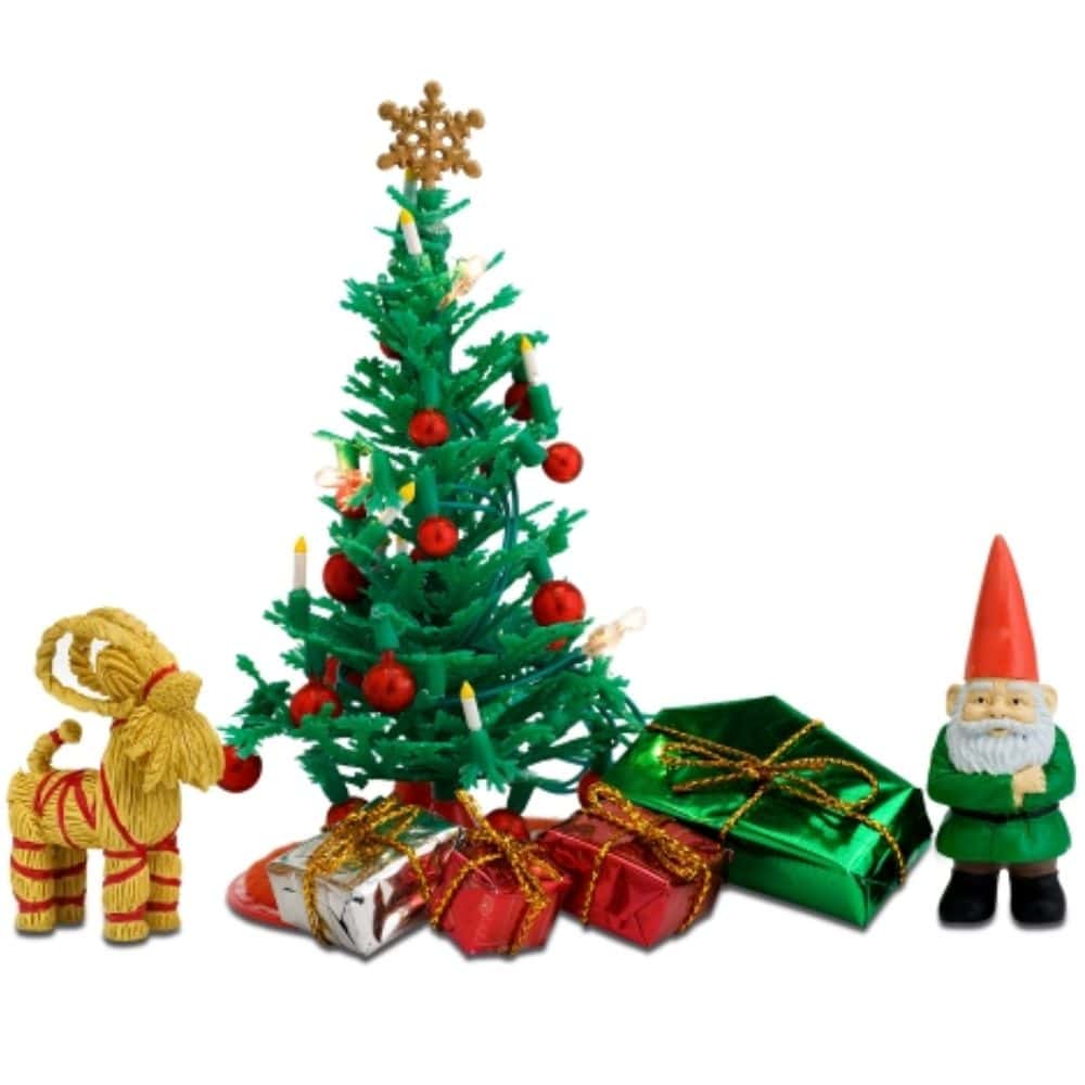- Pakkaus sisältää tontun, olkipukin, joulukuusen ja lahjat.