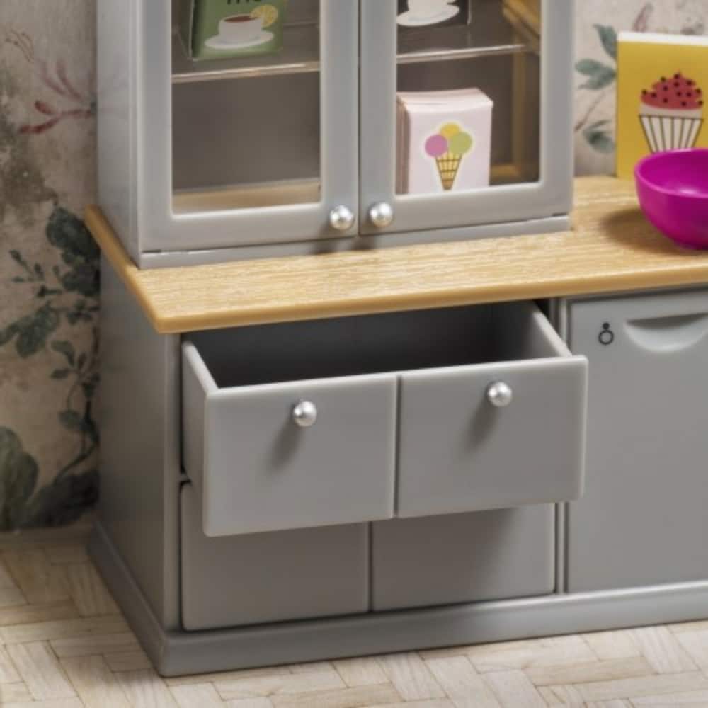 Lundby keittiökaapisto harmaa on kodin sydän! Sisusta nukkekotisi tiskipöydällä, pesualtaalla ja astianpesukoneella, joissa on tyylikkään harmaa väri ja puiset yksityiskohdat. Keittiössä on avattavat kaapit ja laatikot, ja se sisältää myös hienon vitriinikaapin ja paristokäyttöisen LED-valaistuksen.
