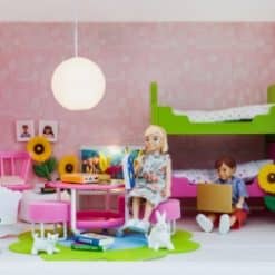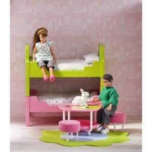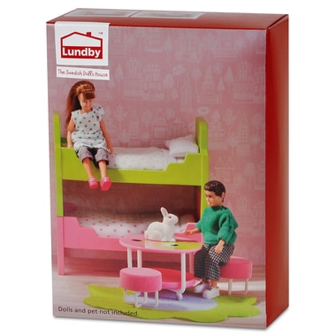 Suosittu värikäs lastenhuonesetti Lundby-nukkekotiin. Sisältää kerrossängyn, jonka voi lattaa myös kahdeksi tavalliseksi sängyksi. Pieni pöytä, jakkarat ja ihanan pehmeä matto täydentävät tämän lastenhuonesetin. Nukkesi voivat nyt nauttia yöunista mukavasti lakanoiden välissä.