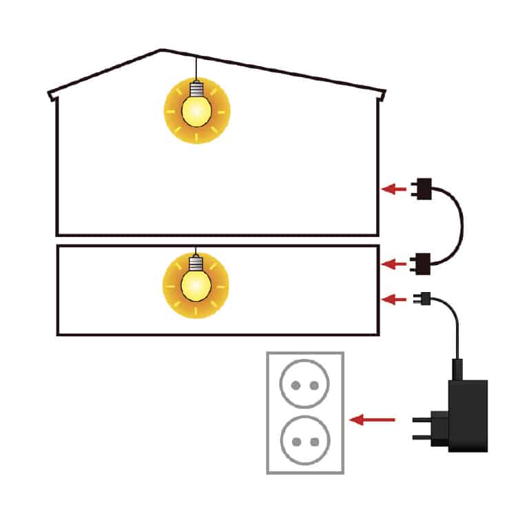 Tarvitset muuntajan, että valot tai valaistut kalusteet toimivat nukkekodissasi. Muuntajassa on suojaus, joka katkaisee virran mahdollisen oikosulun sattuessa.