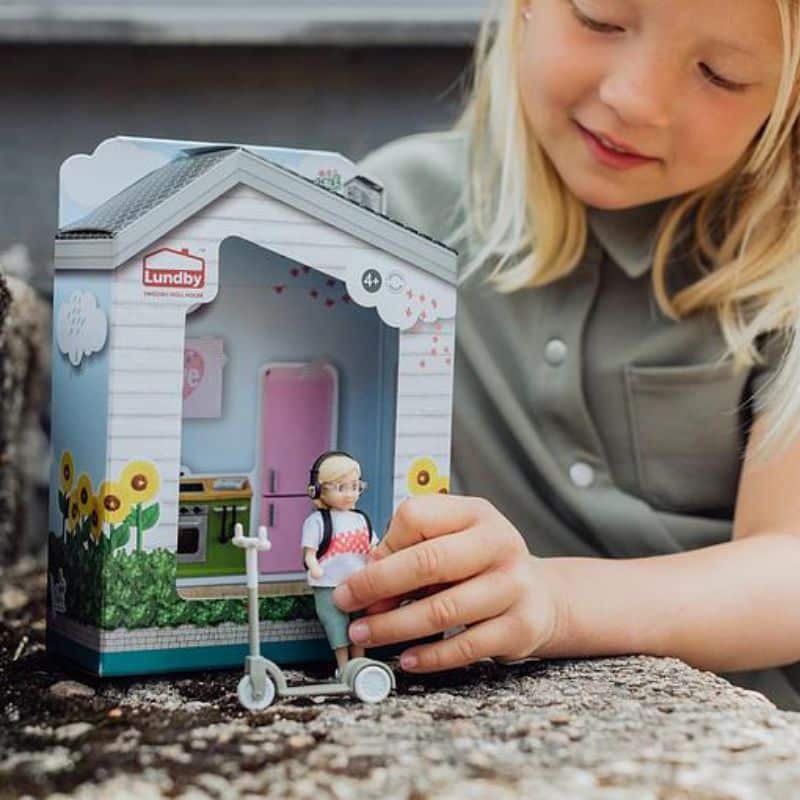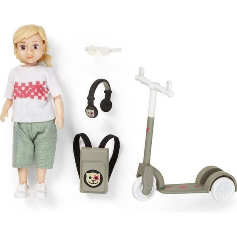 Nukkesetti Lundbyltä. Upea nukkekodin nukke silmälaseilla, kuulokkeilla, repulla ja potkulaudalla. Potkulaudassa on pyörivät renkaat ja kätevät kahvat nuken käsille.