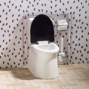 Upea moderni kylpyhuone nukkekotiisi! Kylpyhuonesetti sisältää lavuaarin peilillä, vessanpöntön, maton, korin ja pyyhkeen.