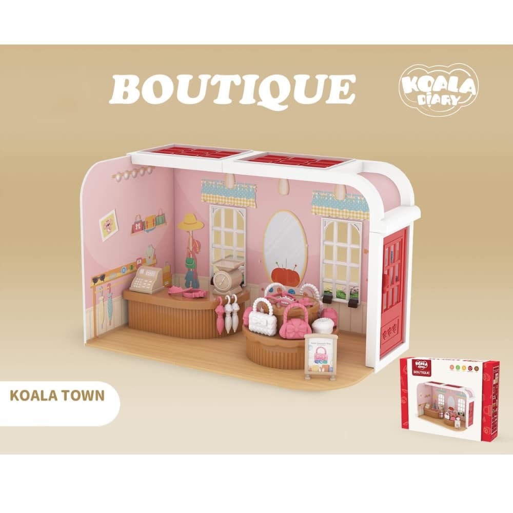 Täysin valmis pikkuhuone nukkekotileikkiin! Leiki sellaisenaan tai hanki useampi huone ja luo nukkekotikokonaisuus! Tämä pikkuputiikkina toimiva kokonaisuus tarjoaa upean laukkuvalikoiman, sateenvarjoja sekä koruja.