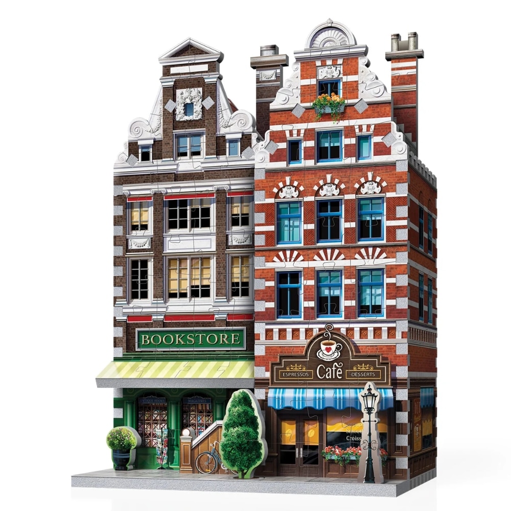 Upean yksityiskohtainen ja hieno kolmiulotteinen palapeli, josta valmistuu kaupunkinäkymän kahvila sekä kirjakauppa.