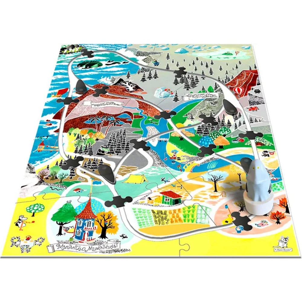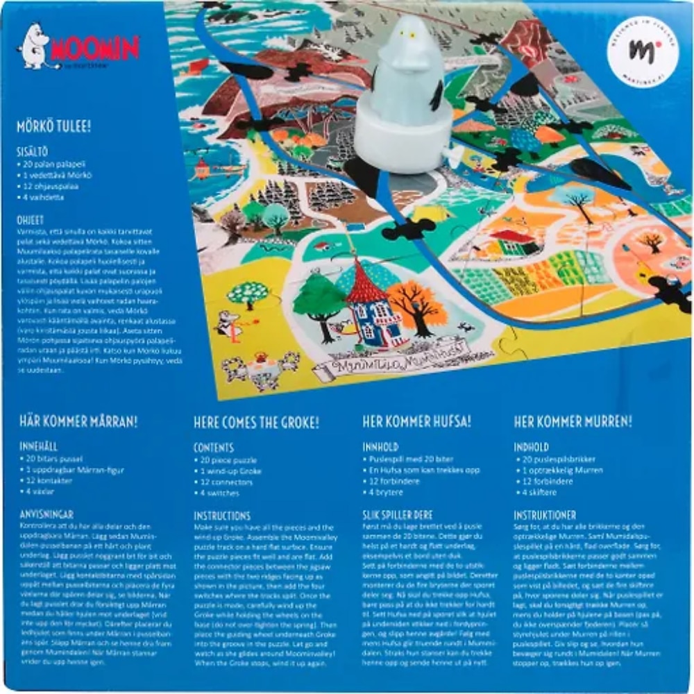 Mörkö Tulee! palapelileikki on hauska peli yli 3-vuotiaille lapsille. Varmista, että sinulla on kaikki tarvittavat palat sekä vedettävä Mörkö. Kokoa sitten Muumilaakso palapelirata tasaiselle kovalle alustalle. Kokoa palapeli huolellisesti ja varmista, että kaikki palat ovat suorassa ja tasaisesti pöydällä. Lisää palapelin palojen väliin ohjauspalat kuvan mukaisesti urapuoli ylöspäin ja lisää vielä vaihteet radan haara kohtiin. Kun rata on valmis, vedä Mörkö varovasti kääntämällä avainta, renkaat alustassa (varo kiristämästä jousta liikaa). Aseta sitten mörön pohjassa sijaitseva ohjauspyörä palapeli-radan uraan ja päästä irti. Katso kun Mörkö liukuu ympäri Muumilaaksoa! Kun Mörkö pysähtyy, vedä se uudestaan.