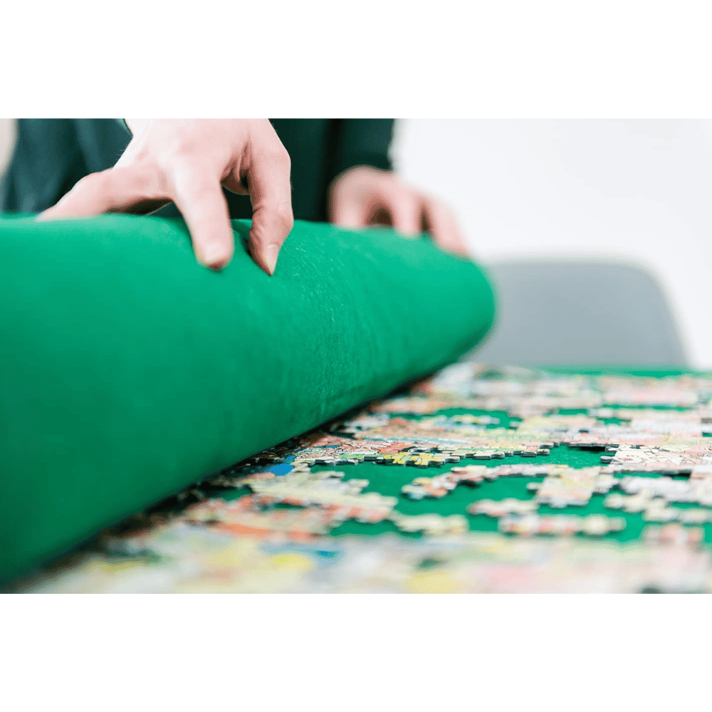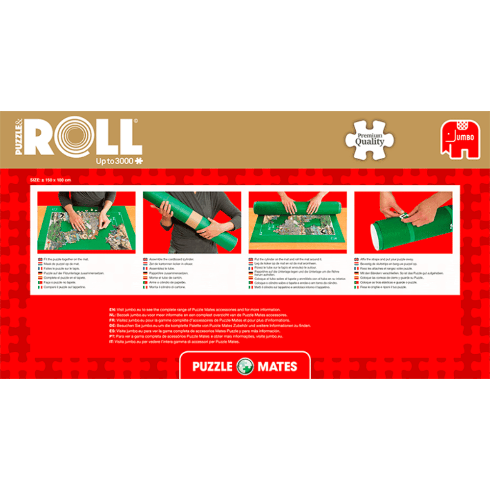 Maton pintamateriaali pitää palaset paikoillaan palapelin ollessa rullalla. Mukana putki, jonka ympärille palapelimatto palapeleineen rullataan, sekäkuminauhat joilla rullan saa pysymään kasassa. Sopii 1500 – 3000 palan palapeleille. 100 x 150cm.