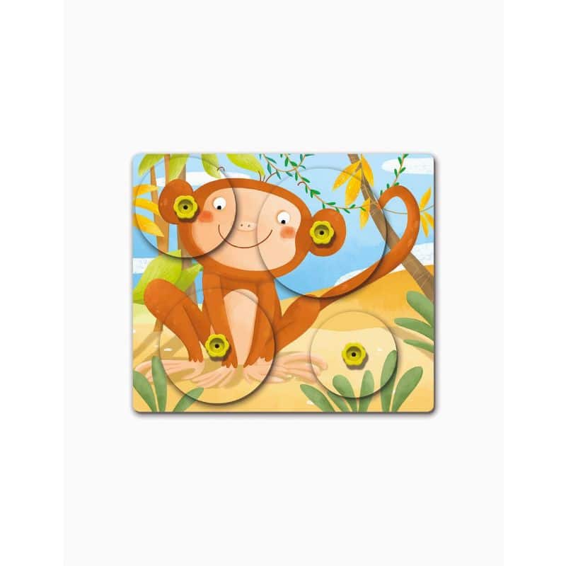 Pakkaus sisältää kaksi lautaa, jossa on neljä erilaista kuvaa, muovisia ruuveja ja muttereita sekä kahdeksan pyörivää levyä, joissa on molemmin puolin eläimen kuvia.