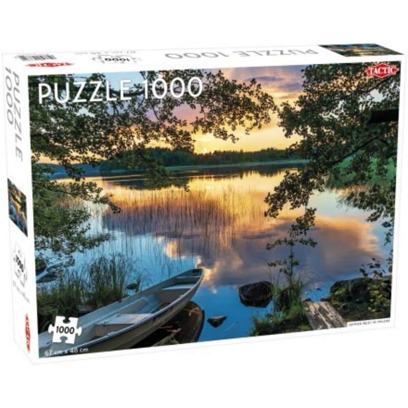 Koe suomalaisen kesäyön taianomaisuus! 1000:n palan palapelissa riittää haastetta ja hauskaa tekemistä kotipäiviin ja sen kokoaminen on erinomaista aivojumppaa kokeneemmallekin palapelin tekijälle. Tacticin palapelit valmistetaan Suomessa, tunnetaan hyvästä laadusta ja niiden palat ovat toisiinsa yhteen sopivat.