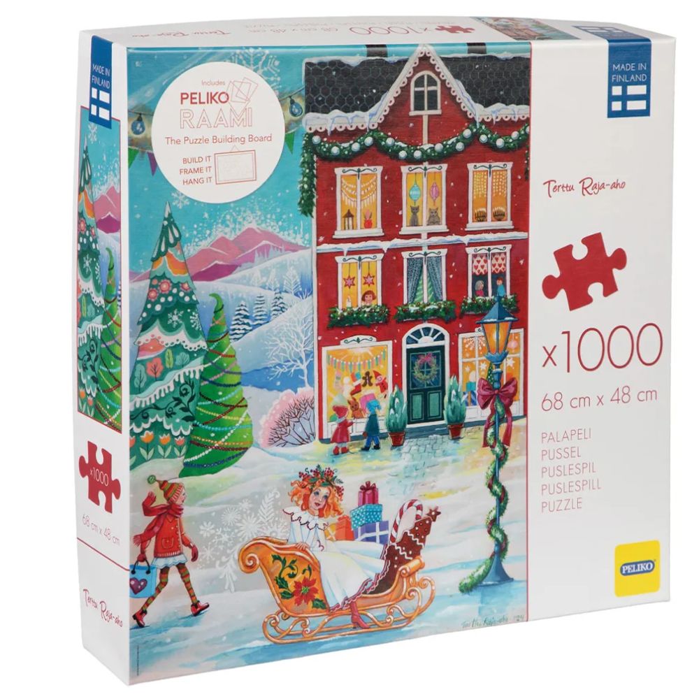 Kuvassa luminen katu täyttyy joulun valosta ja ilosta – lapsia kiinnostavat näyteikkunat ja reessä istuva Lucia-neito tekevät tunnelmasta taianomaisen.Palapelissä on 1000 palaa, ja se on valmistettu kierrätyskartongista Suomessa. Mukana tulee Peliko Raamiin -kokoamisalusta, jonka avulla palapeli on helppo kehystää 50 x 70 cm -kehykseen.Palapelien kokoaminen on mukavaa ajanvietettä yksin tai yhdessä – täydellinen tapa nauttia talvi-iltojen rauhasta ja joulun hengestä.