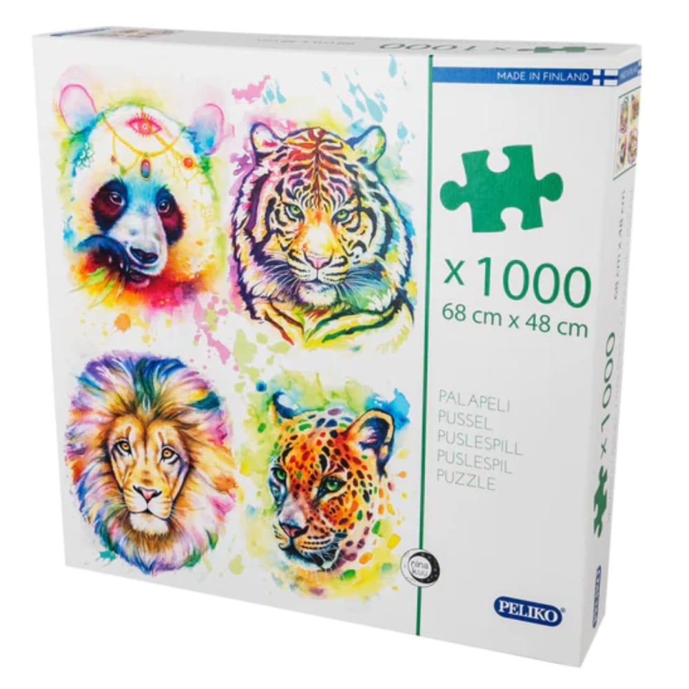 Palapeli 1000 palaa villieläimet Nina Kuu Peliko. Taiteilija Nina Kuun kuvittama 1000 palainen palapeli. Nyt pääset kokoamaan upeat villieläimet panda, tiikeri, leijona ja leopardi. Koottuna palapelin koko on noin 68 x 48 cm. Peli on valmistettu Suomessa kierrätyskartongista.