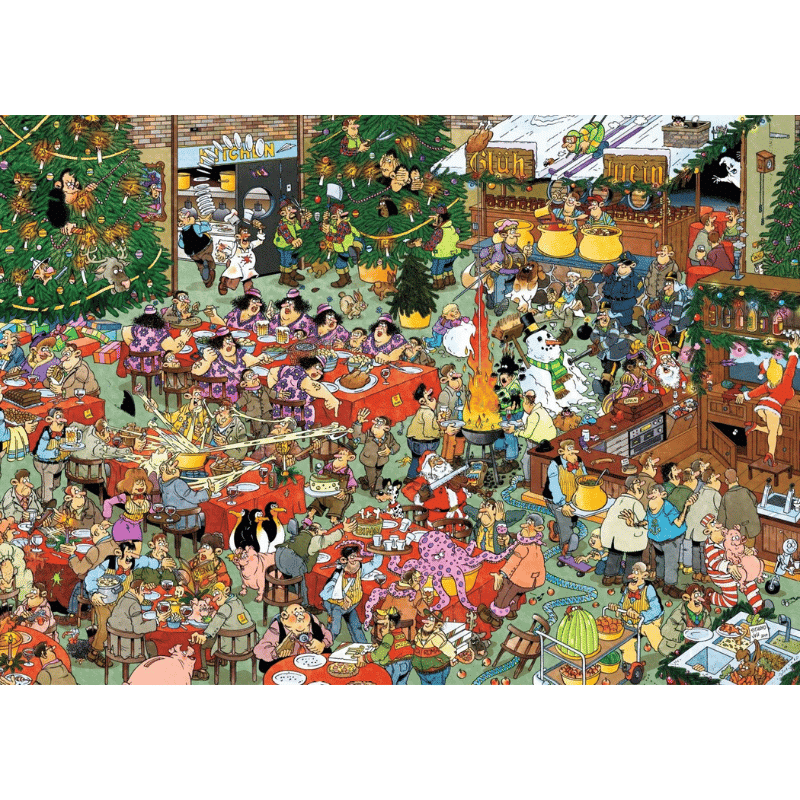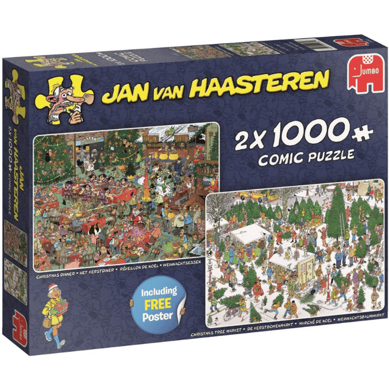 Jan van Haasteren on vuosikymmeniä luonut erittäin yksityiskohtaisia, värikkäitä ja ennen kaikkea humoristisia kuvia. Laatu ja innovatiivisuus leimaavat Jumbon tuotteita. Palapelit ovat ympäristöystävällistä kierrätyspahvia. Jokainen pala on ainutlaatuinen ja palat sopivat hyvin yhteen. Tuotteet valmistetaan Alankomaissa. Jumbon palapeleissä on 1000 palaa ja valmiiden palapelien koko on noin 68 x 49 cm. Pakkaus sisältää kaksi 1000:n palan yksityiskohtaista joulu aiheista palapeliä ja julisteen.