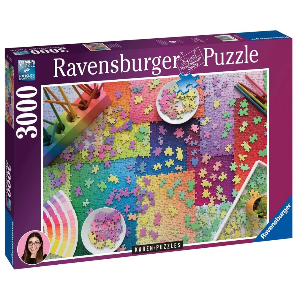 Ravensburgerin Puzzles On Puzzles 3000 palapeli tarjoaa haasteen ja elämyksen niin kokeneille palapelinrakentajille kuin aloittelijoillekin. Tämä huolella suunniteltu palapeli vie sinut matkalle värikkäiden ja monivaiheisten kuvioiden maailmaan.