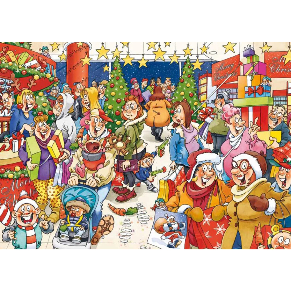 Tavaratalo on täynnä ihmisiä, jotka haluavat vielä ehtiä ostamaan joululahjoja ennen joulua! Kauppa näyttää upealta, kun on joulukuusia, katossa roikkuu joulutähtiä ja työntekijät ovat pukeutuneet jouluasuihin – mutta mitä ostajat oikein katselevat? Halvalla myytävää lelua, jolla he voivat ilahduttaa lapsiaan? Se kuva sinun täytyy koota tämän palapelin paloista!